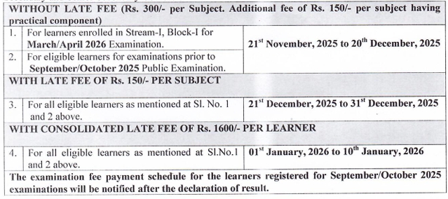 The learners of Senior Secondary Course must ensure a compulsory gap of two years from the block/session and year of passing the Secondary examination for the purpose of obtaining passing certificate. If the learner does not have the requisite gap of two years, he/she shall register only in a maximum of four subjects (including the subjects already passed) for the forthcoming April - May 2026 examinations. The learners may therefore carefully select the subject(s) accordingly to appear in the examinations. The requisite examination fee is to be paid only through online mode by visiting the NIOS website: sdmis.nios.ac.in
